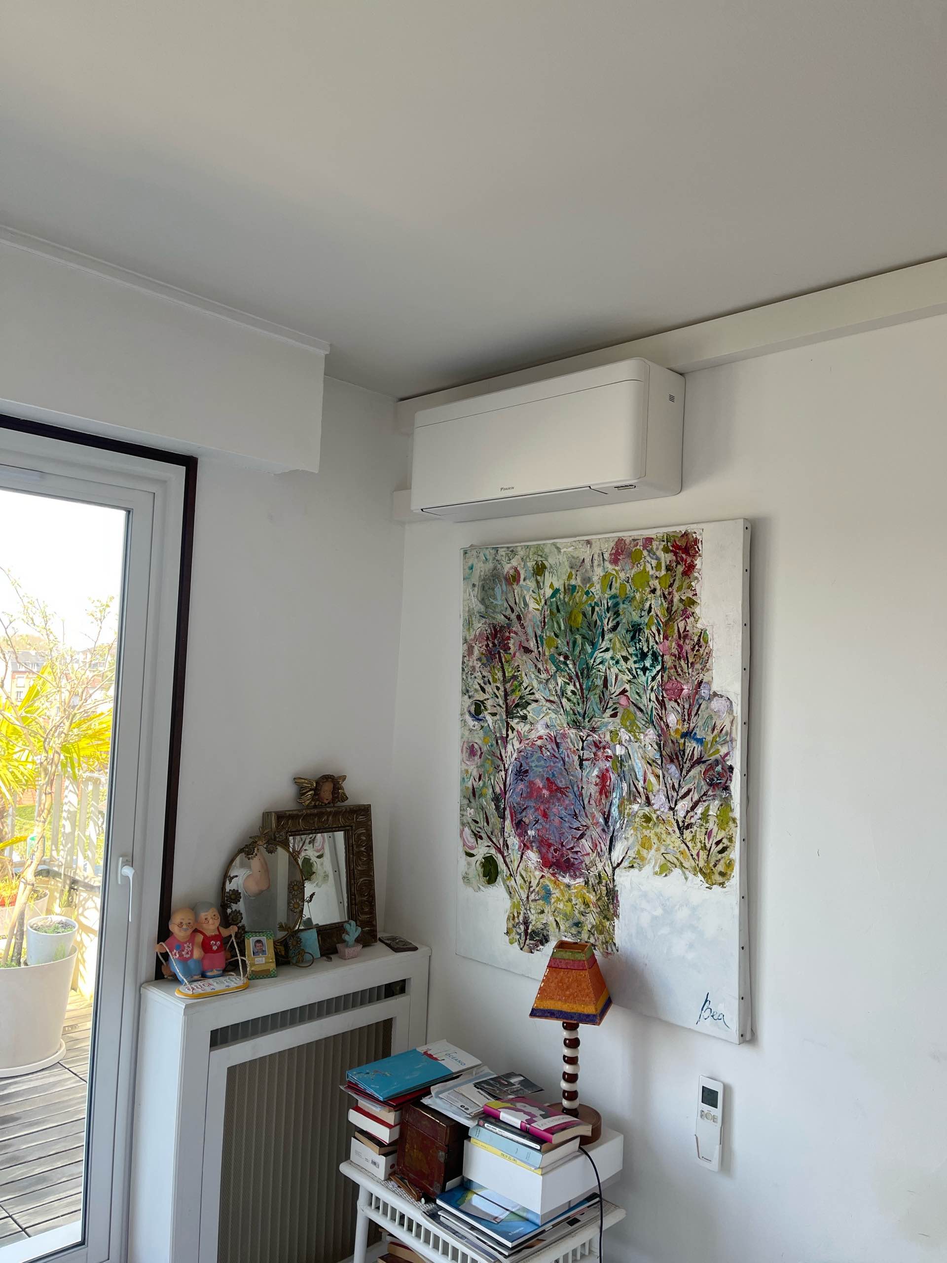 L’unité intérieure au design épuré s’intègre parfaitement dans le décor moderne de l’appartement. Les goulottes blanches se fondent dans les murs, et l’unité extérieure, positionnée judicieusement, reste très discrète depuis la rue.
